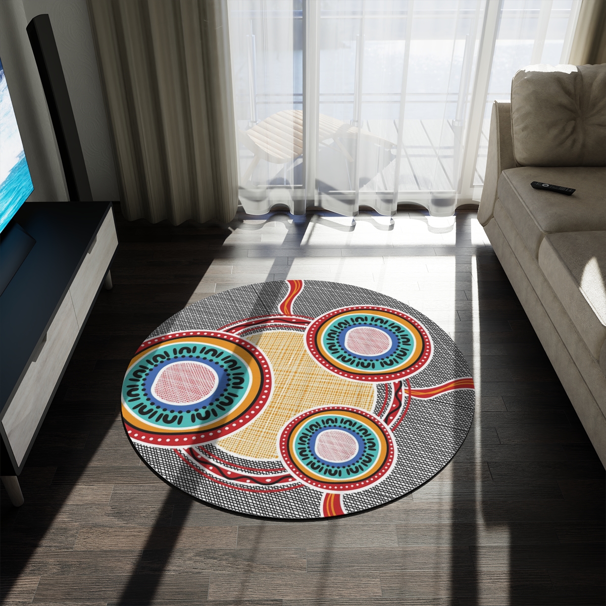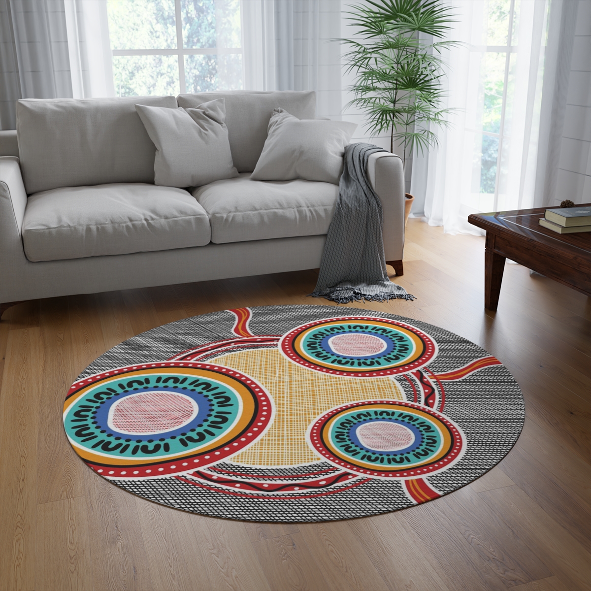 Decorative rugs with fun, bright designs have made a huge comeback. Create a stunning design with graphics or funky characters, and print them on this round 100% polyester chenille rug in picture-perfect quality. It features a coated backing and hemmed edges for durability.