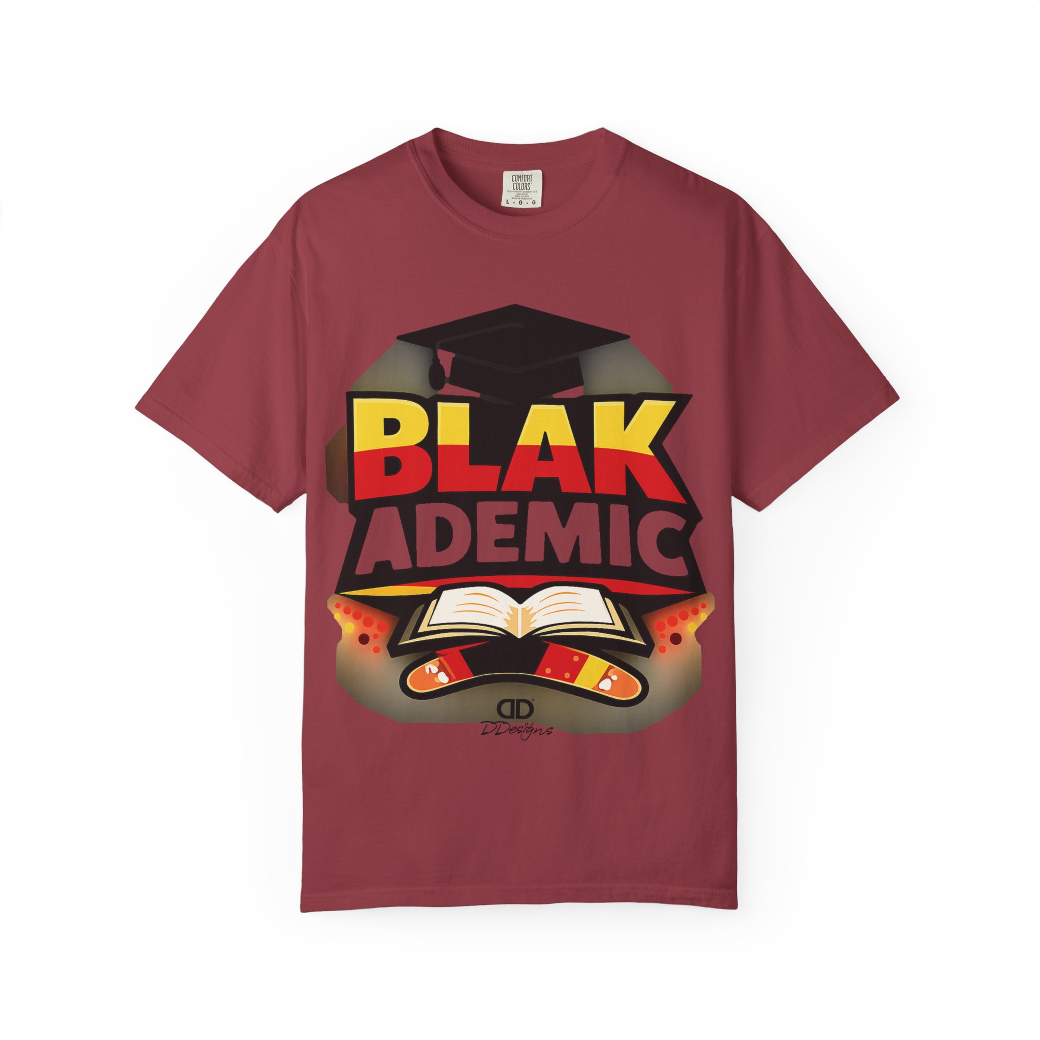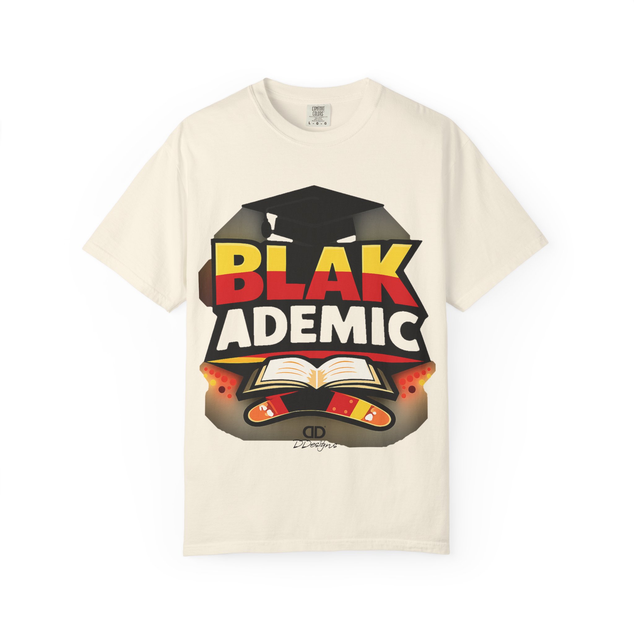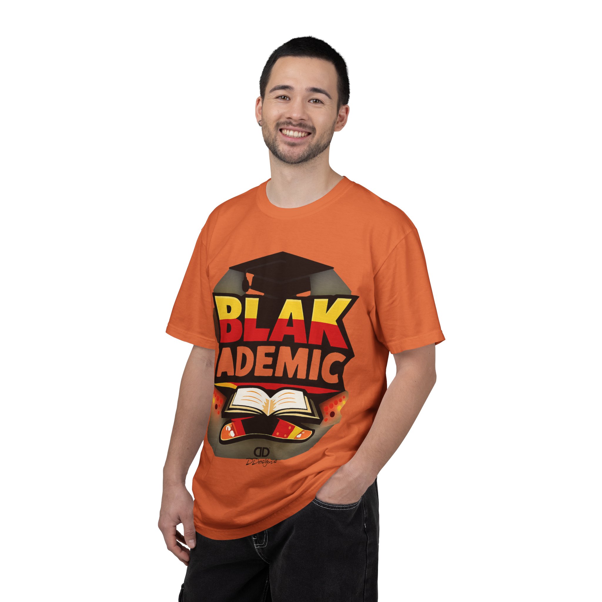 A heavyweight, garment-dyed tee that carries bold academic pride with a bright, graphic design. The large front print features a graduation cap, an open book, and vivid lettering that reads “BLAK ACADEMIC,” evoking study, celebration, and cultural empowerment. Wear it to lectures, study sessions, campus events, or community gatherings — it settles in soft and broken-in from the first wear and holds its shape through repeated washings. The relaxed fit and substantial cotton drape give this shirt presence without stiffness; the tubular knit and double-needle stitching mean fewer seams and long-lasting construction. Available in many colors and sizes so you can choose a hue that matches your mood or school colors.