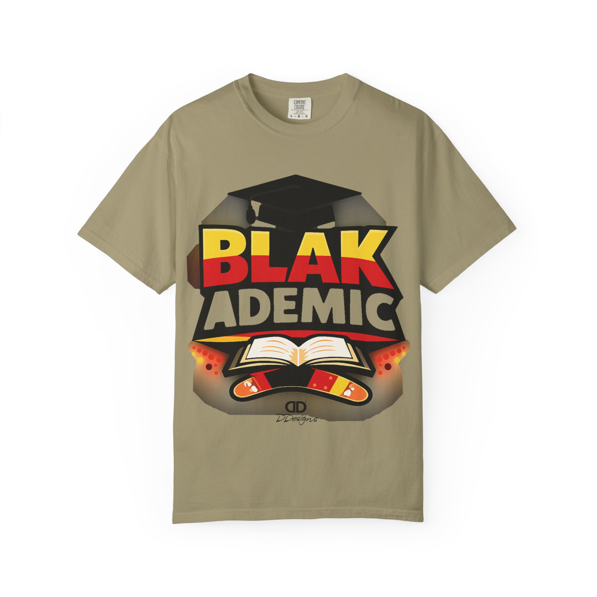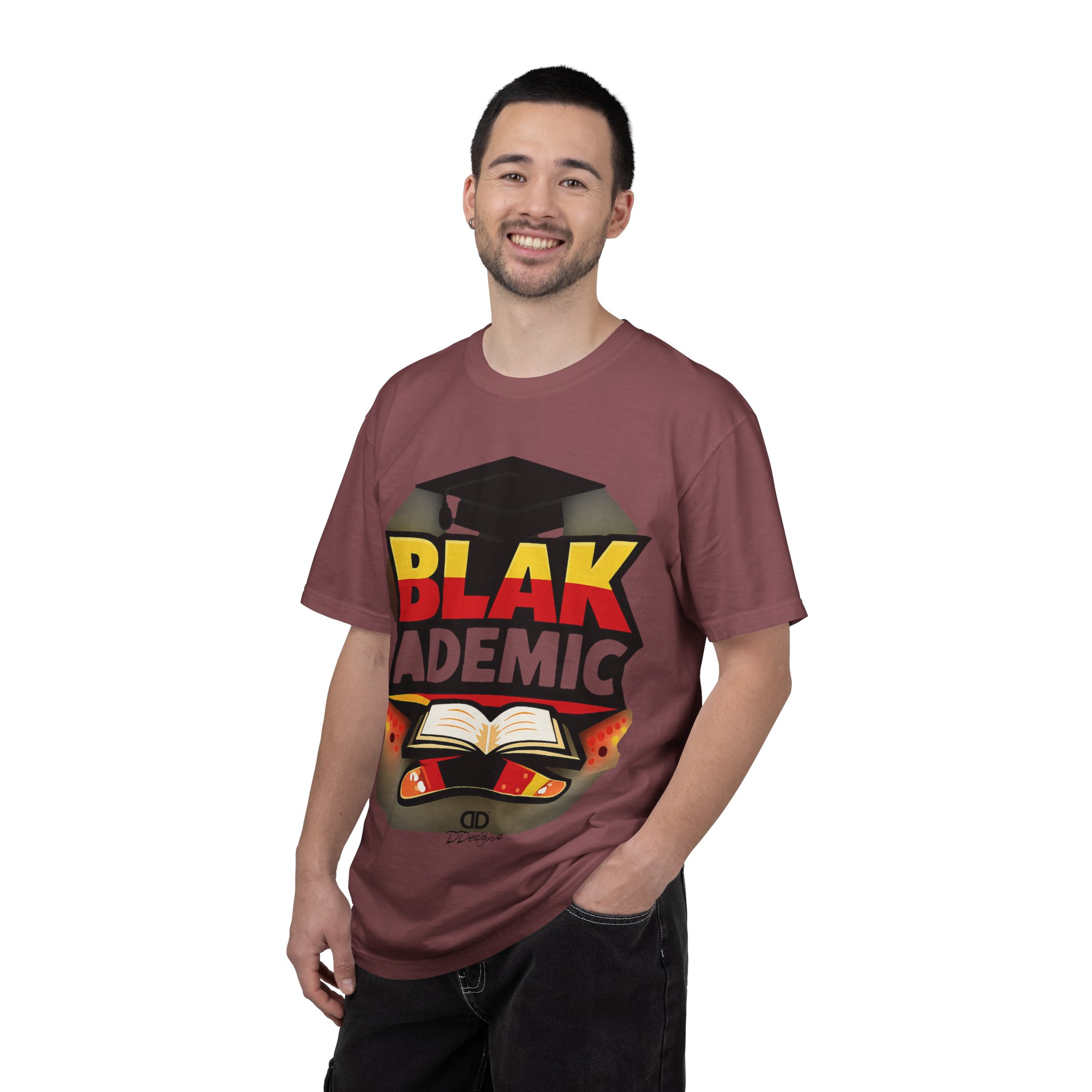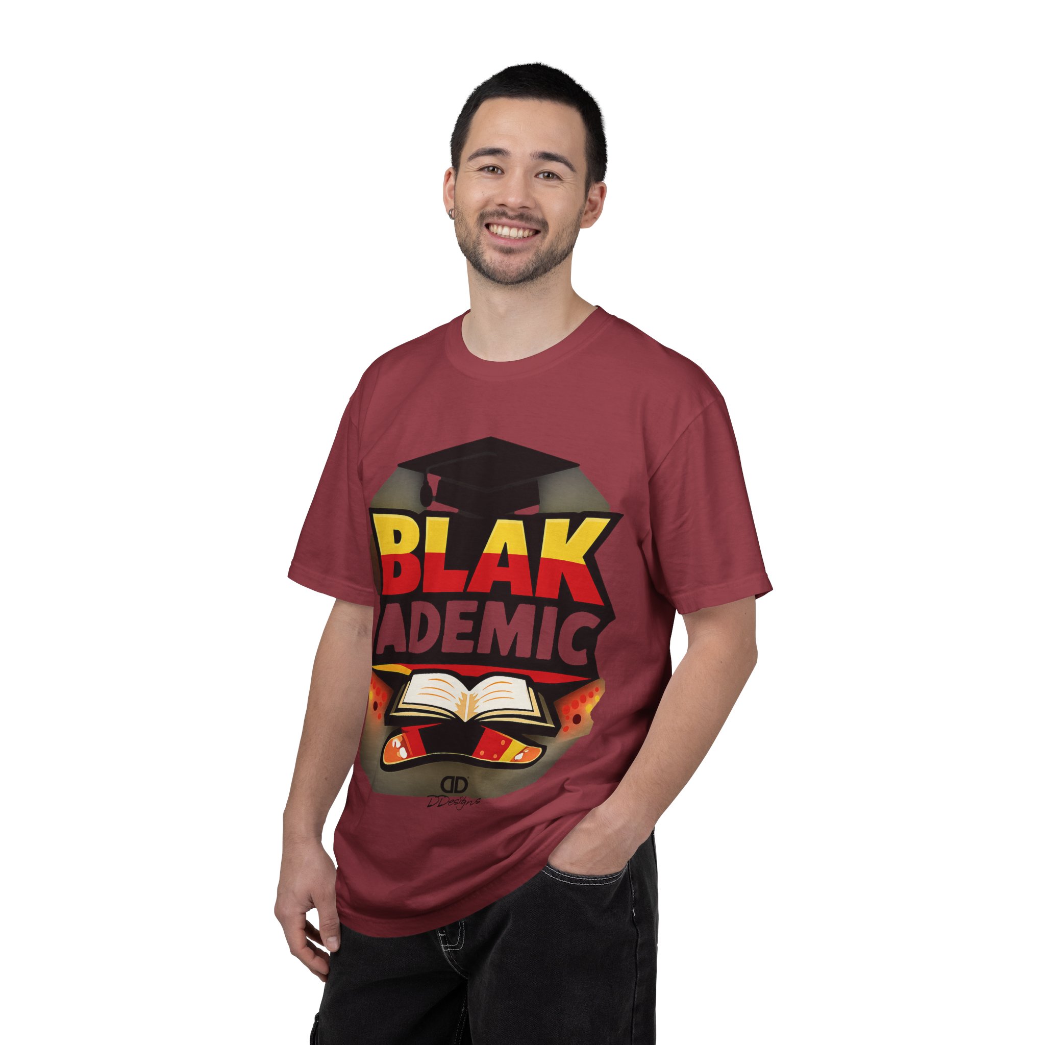 A heavyweight, garment-dyed tee that carries bold academic pride with a bright, graphic design. The large front print features a graduation cap, an open book, and vivid lettering that reads “BLAK ACADEMIC,” evoking study, celebration, and cultural empowerment. Wear it to lectures, study sessions, campus events, or community gatherings — it settles in soft and broken-in from the first wear and holds its shape through repeated washings. The relaxed fit and substantial cotton drape give this shirt presence without stiffness; the tubular knit and double-needle stitching mean fewer seams and long-lasting construction. Available in many colors and sizes so you can choose a hue that matches your mood or school colors.