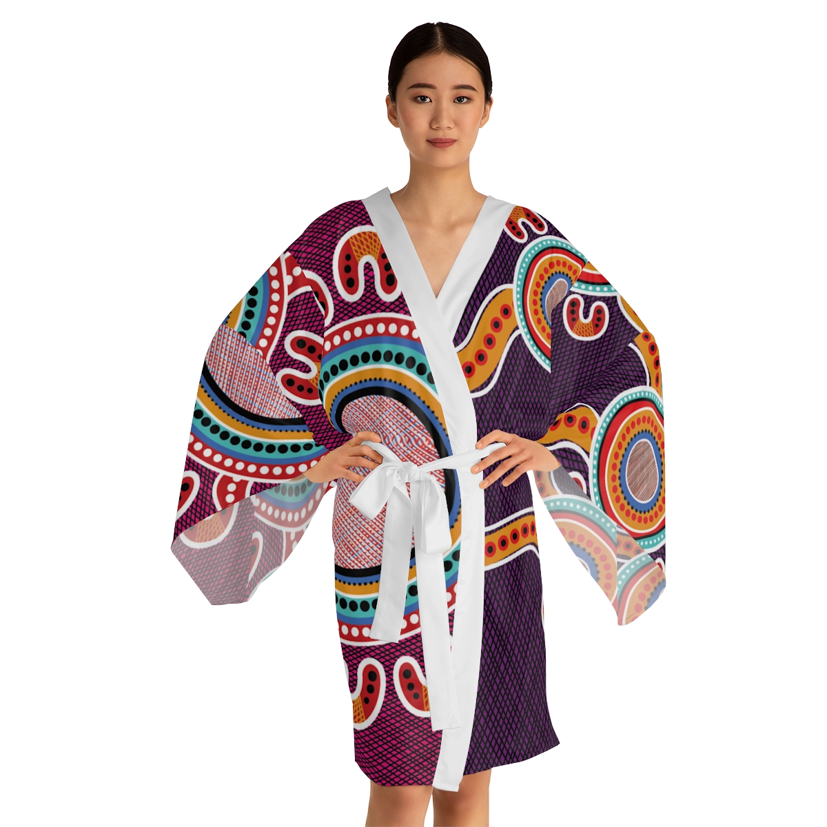 Whether it’s lounging at home or making a stylish appearance, these kimono-style robes are as beautiful as they are cozy. With a figure-flattering shape, this chic mid-length robe features the signature flowing bell sleeves and a belt, making it an absolute delight for Japanese style enthusiasts. Each kimono is 100% made with Polyester for that smooth & silky feel.